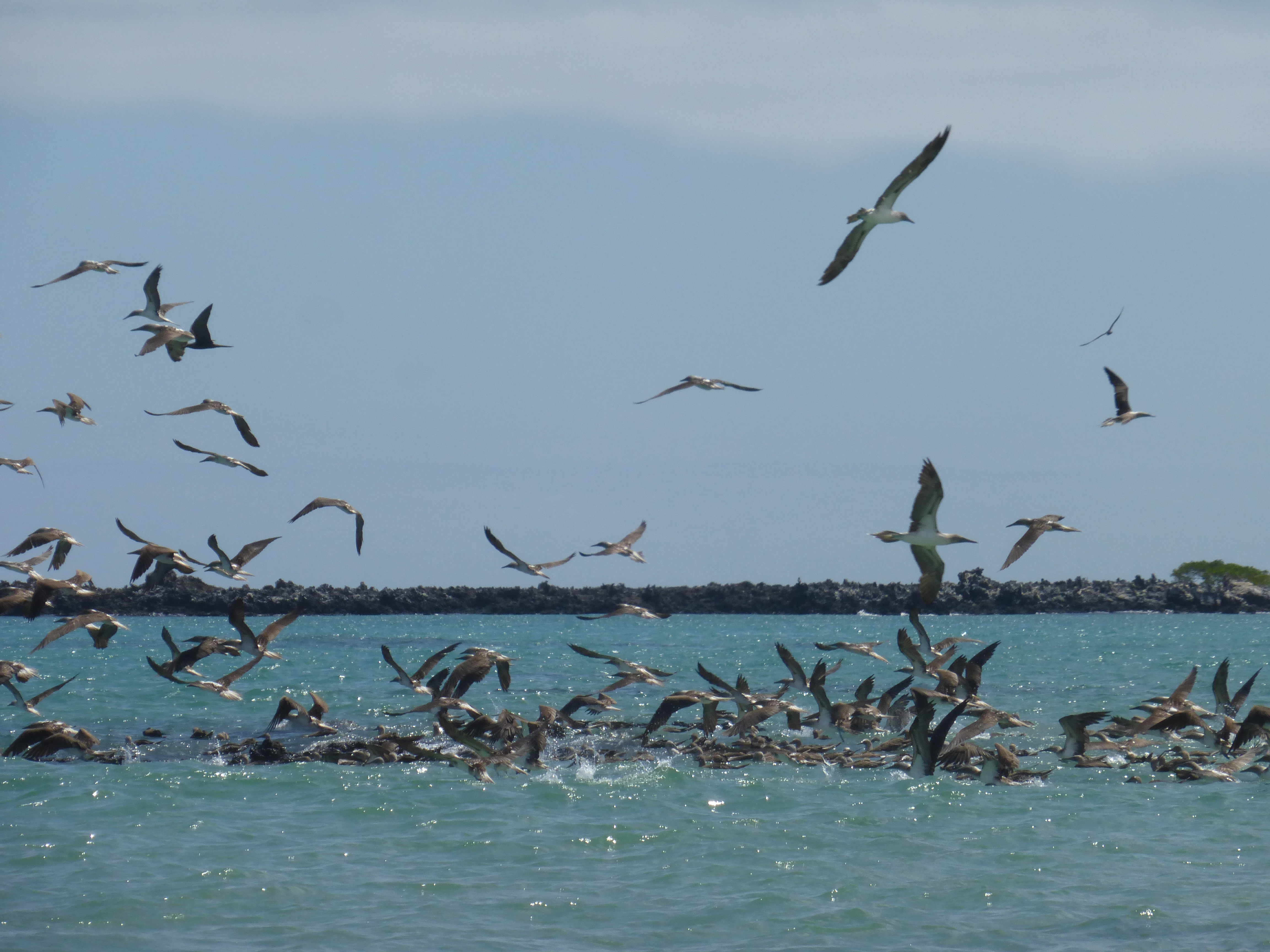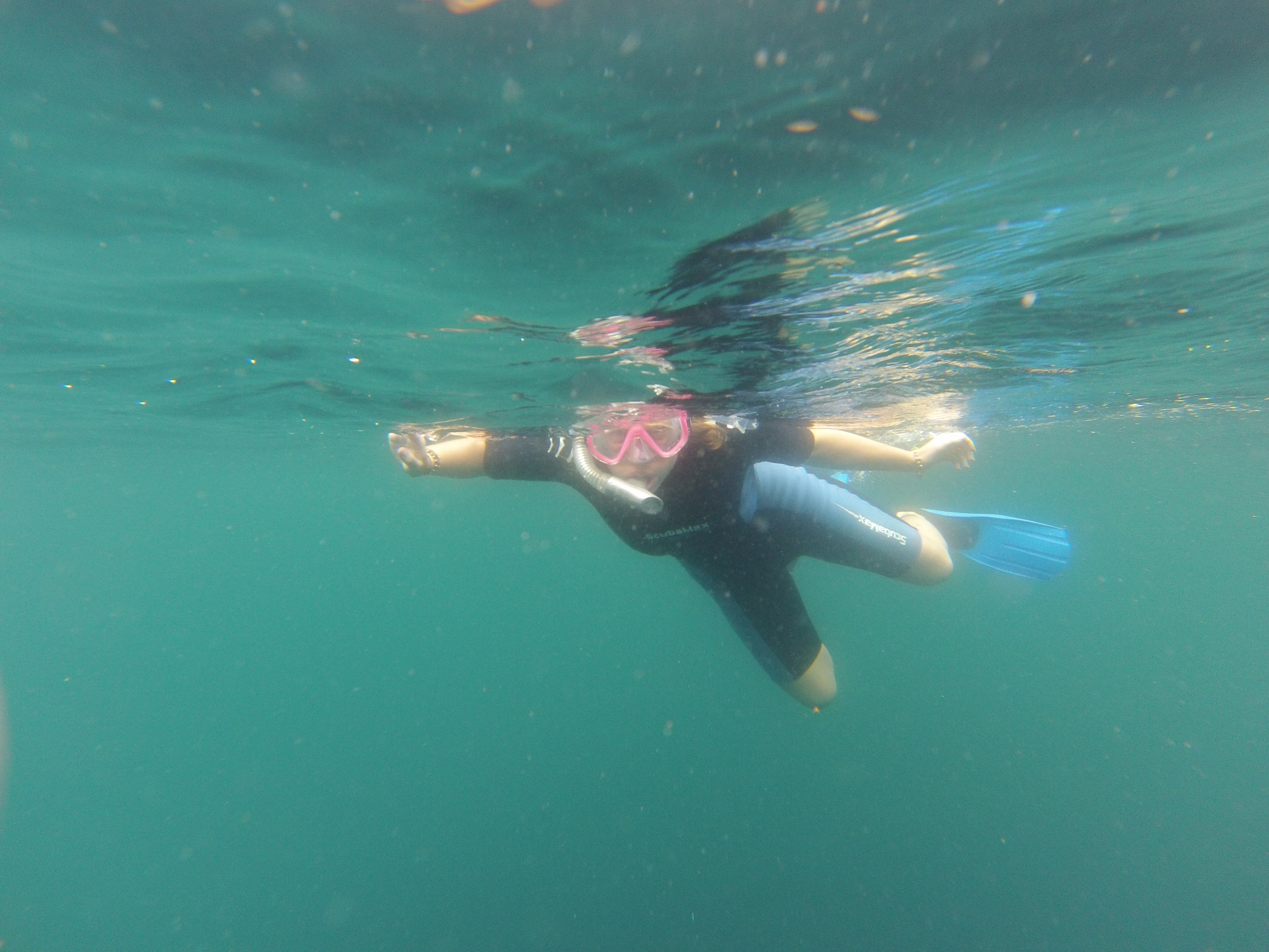 War ich schon von diesem Schnorcheltrip total begeistert, haute mich unser nächster Trip ins blaue Etwas total von den Socken. Wir fuhren mit dem Boot in die sogenannten „Tunnel“ hinein: eine riesige Steinformation, die aufgrund von Erdbewegungen zu einer Art Tunnellandschaft über Wasser wurde. Auf den Felsen sahen wir neben Pinguinen die sogenannten Blaufußtölpel, ein tropischer Meeresvogel mit blauen Füßen. Unter Wasser schwommen wir durch die Tunnel hindurch und entdeckten Seepferchen, die an Pflanzenstengeln unter Wasser sich langsam hin und her bewegten. Dann ging es zum zweiten Schnorchelspot – hier wurden uns Meereschildkröten und Haie versprochen. Wir schnorchelten los und begegnetem einen riesigen Schwarm von rochenähnlichen Fischen (deren Name ich aber komplett vergessen habe 😉 ) Dann hieß es von unserem Reiseführer „Folgt mir“ und wir schwammen zu einer Höhle. Ich hielt die Luft an, unser Guide drückte mich tief ins Wasser, sodass ich in die Höhle schauen konnte – und da waren sie: Haie. Fünf bis sechs Weißspitzen-Riffhaie ruhten dort im Dunkeln, bewegten sich nicht und alles, was leuchtete, waren ihre Augen. Dieser Moment war einzigartig – so unglaublich und gruselig zur selben Zeit. Nach ein paar Sekunden wurde mir bewusst, was ich dort eigentlich sah: Haie, nur wenige Meter von mir entfernt, ich in ihrem Terrain – und ich riss meinen Blick los und schwamm wieder an die Wasseroberfläche. Überwältigt von dem, was ich gerade gesehen hatte, schwammen wir einige Meter weiter und warteten im Wasser, während unser Reiseführer etwas murmelte und zu einer anderen Steinformation ein paar Meter weiter schwamm. Ich steckte meinen Kopf wieder unter Wasser – und sah plötzlich einen (für mich riesig aussehenden, aber bestimmt mindestens zwei Meter langen) Hai direkt unter Mike entlang schwimmen, nur Zentimeter von ihm entfernt. Ich hob den Kopf, keuchte „Mike, da ist ein Hai direkt unter dir“, (er hatte ihn schon lange entdeckt) und schaute dem Hai dann zu, wie er davon schwamm. Was für ein surrealer Moment! Ein Hai, zentimeternah entfernt! Wir machten uns auf zu einem anderen Teil der Bucht und während ich versuchte mich von meinem Schock/Freude zu erholen, schwammen plötzlich noch drei weitere Haie an uns vorbei. Unglaublich. Im nächsten Teil der Bucht angekommen, sahen wir dann das letzte Tier, das noch ganz weit oben auf meiner Wunschliste stand: eine riesige Meeresschildkröte. Und zwar ganz schön nah, denn sie störte sich absolut nicht an der Handvoll Schnorchler, die sie umrundeten. Ich sah der Schildkröte einfach nur zu, wie sie im Wasser ihre Kreise zog und als sich dann noch eine zweite, genauso riesige Schildkröte zu ihr gesellte, dachte ich nur: besser kann das Leben doch kaum werden, oder?