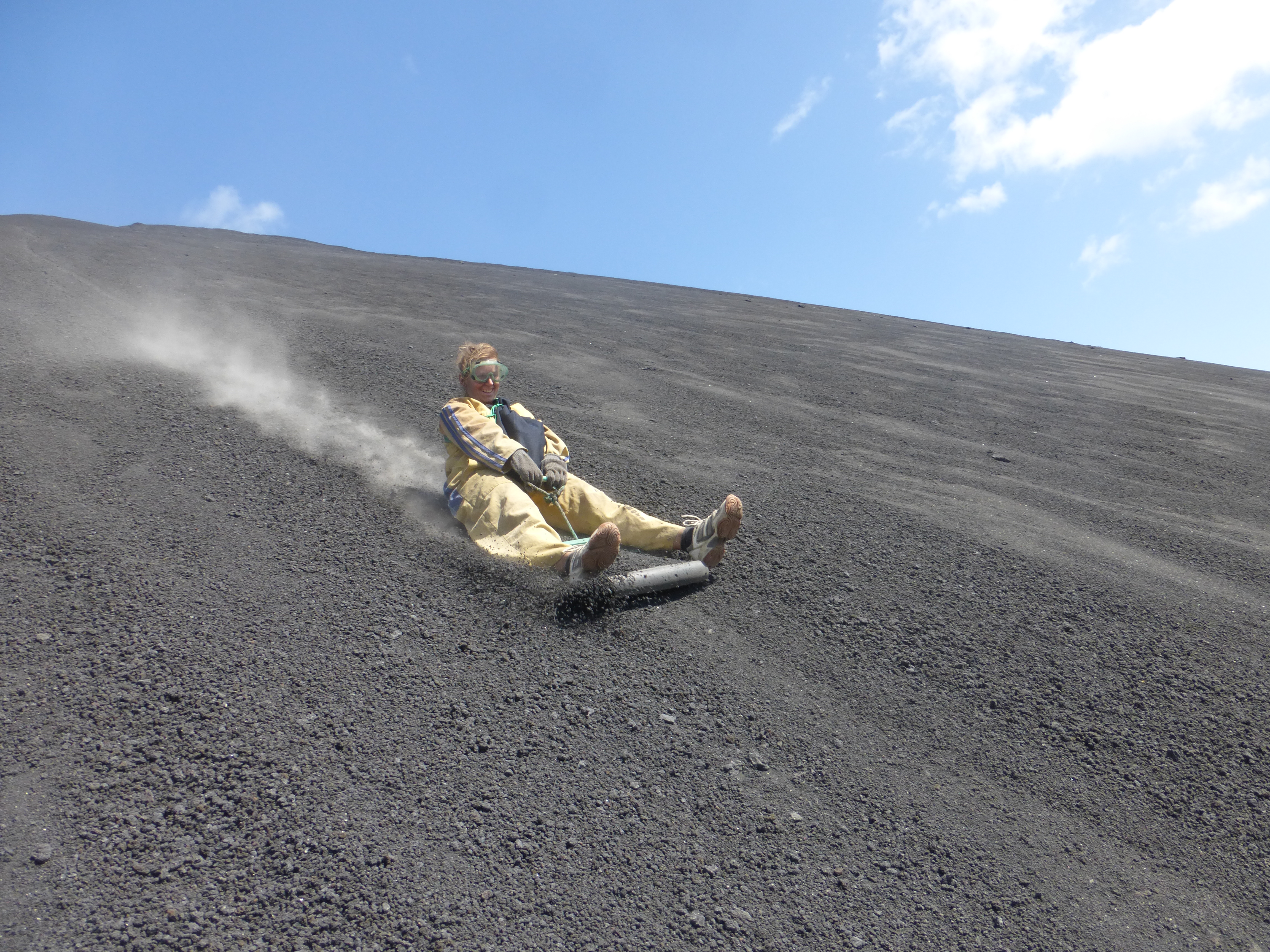 Denn war schon beim ersten Aufstieg der Wind recht stark, so war das doch nichts im Vergleich zum zweiten Mal. Je höher wir kamen, desto stärker blies der Wind. Und mit einem Board unter dem Arm war die Angriffsfläche für den Wind ziemlich groß. Wir liefen also den schmalen Weg über dem Vulkan entlang, rechts der Krater, links der Abgrund – und der Wind blies so stark, dass ich das Gefühl hatte, im nächsten Moment weggeblasen zu werden. Mehrere Mal musste ich mein Board absetzen und mich hinhocken, da ich dachte, dass mich der Wind sonst vom Vulkan bläst. Das waren durchaus beängstigende Minuten. Dann aber oben angekommen gab es Besseres, als über den Wind nachzudenken: die zweite Abfahrt stand an. Ich setzte ich mich auf´s Board, diesmal mit der Absicht, so wenig wie möglich zu bremsen, um schön schnell zu werden. Und wie schnell ich wurde. Ich raste in einem gelben Schutzanzug einen schwarzen Vulkan hinunter, mit Blick auf das Tal, durchzogen von anderen Vulkanen – was für ein Gefühl. Irgendwann musste ich dann doch ein wenig bremsen, da ich so schnell wurde, dass ich das Gefühl hatte, gleich die Balance zu verlieren. Aber ich schaffte es bis nach unten, ohne zu fallen. Yiheaa! Was für ein Erlebnis! Ich bin einen aktiven Vulkan hinuntergeboardet!