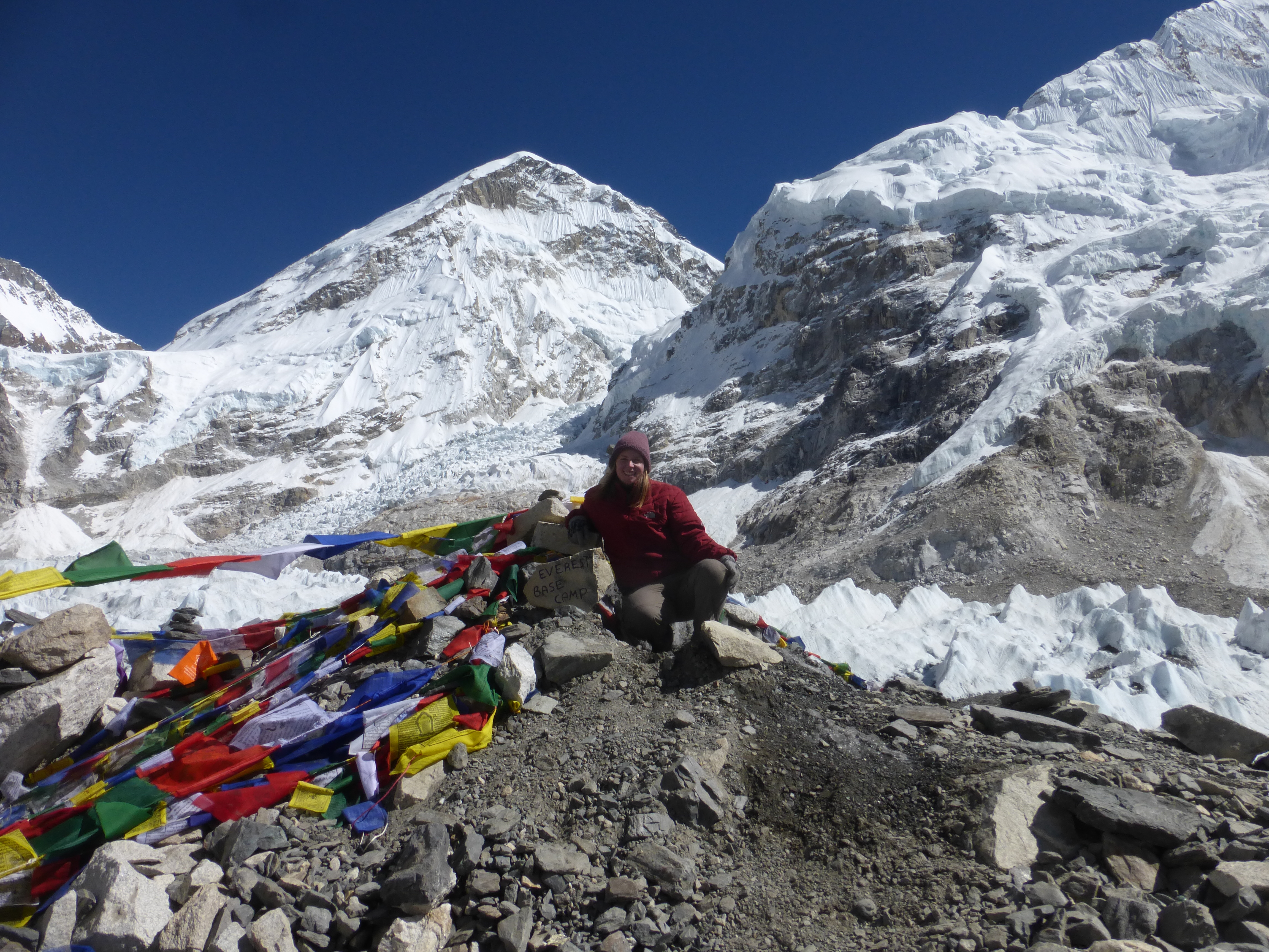 We stepped out of our teahouse, turned left and right in front of us was the sign “To Everest Base Camp”. Oh, how I couldn´t wait to get there. We made our way along a beautifully clear stream that wound through the valley. After half an hour anything you could have called a path was completely gone. All that was left where big rocks – in front of us, next to and behind us. Once more we were following others as we had zero idea which way to walk. And believe me – you needed to know where to go. As one wrong step might as well meant a fall of a couple of metres. We hiked up and down, over the rocks, between them and at times even kind of crawled. And then we saw it. It was still too far away to really see it but a good few hundred metres away from us there seemed to be a congregation of people. So we made our way down the rocks, climbing along the glaciers that now completely surrounded us. Then it was a last hill up. And finally, we were suddenly there. We had made it. In front it lay it – the Base Camp for the highest mountain on this planet.