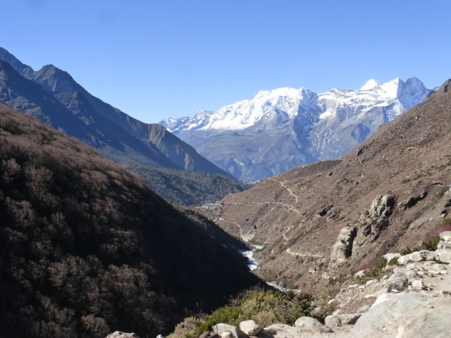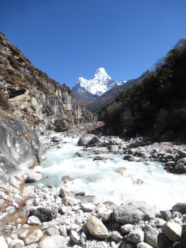 And then it was time to head back down. We had a long day ahead of us. We slid back down to Gorak Shep, had another mighty breakfast made out of cheesy toast, eggs and beans, put on our backpacks and started the long way back down. Over the next three days we would have to walk back down the exact way we came up. The difference: We would walk down in altitude which meant we could do a lot more hours in a day as we didn´t have to worry about the altitude anymore. So that’s what we did. We hiked up, and hiked down. Over mountains and bridges. Through valleys and streams. After another 8 hours we had made it back to Pheriche – exhausted, but eager to make it back to Namche Bazaar the next day.